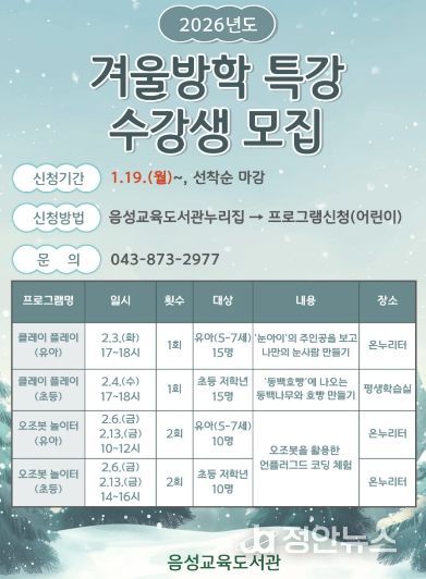 음성교육도서관 백경미 관장은“이번 겨울방학특강은 아이들이 도서관에서 책과 놀이, 체험을 통해 즐겁게 배우는 시간을 가질 수 있도록 기획했다.”며 “도서관이 아이들의 상상력과 배움이 자라는 공간이 될 수 있도록 노력하겠다”고 밝혔다.