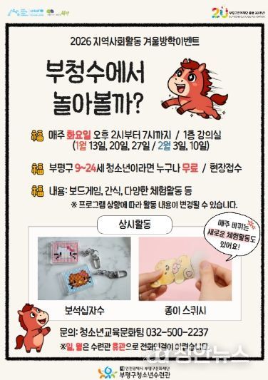 정안뉴스 안정주 기자 | 부평구 청소년수련관은 오는 20일부터 다음달 10일까지 겨울방학을 맞아 지역 청소년을 위한 2026 지역사회활동 겨울방학 이벤트 ‘부청수에서 놀아볼까’를 진행한다.