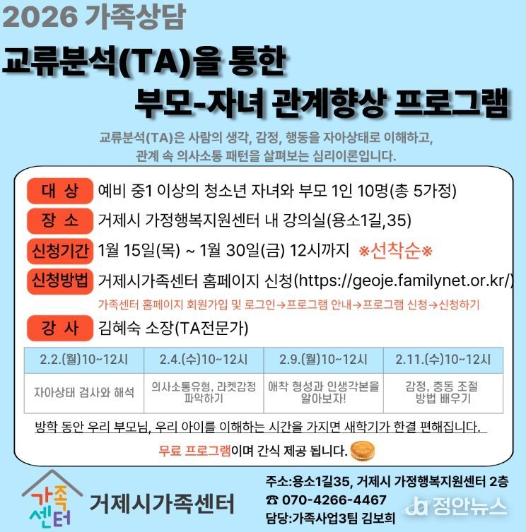 정안뉴스 김재홍 기자 | 거제시가족센터는 오는 2일부터 진행하는'교류분석(TA)을 통한 부모–자녀 집단상담 프로그램' 참여자를 모집한다고 밝혔다.