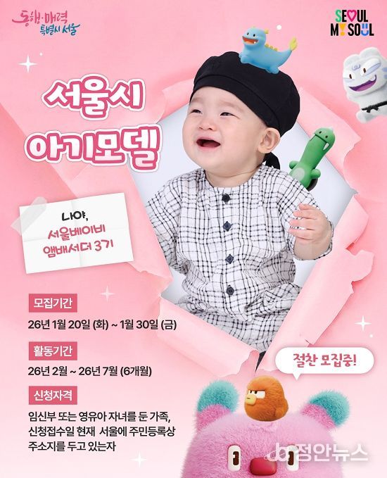정안뉴스 안정주 기자 | 생생한 육아 일상을 통해 아이를 키우는 기쁨과 그 과정에서 도움을 받을 수 있는 서울시의 다양한 임신·출산·육아 정책을 시민 눈높이에서 소개할 ‘서울베이비앰배서더’(baby ambassador)의 새 얼굴을 찾는다.