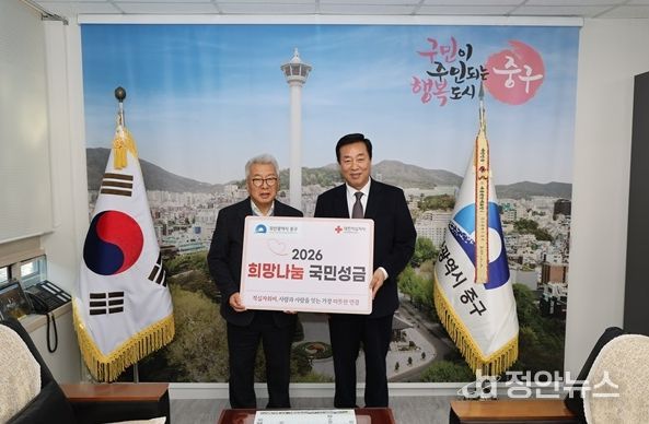 정안뉴스 황정혜 기자 | 부산 중구는 지난 16일 대한적십자사 부산지사에 2026년도 적십자 특별회비 100만 원을 전달하며 이웃사랑 실천에 나섰다.