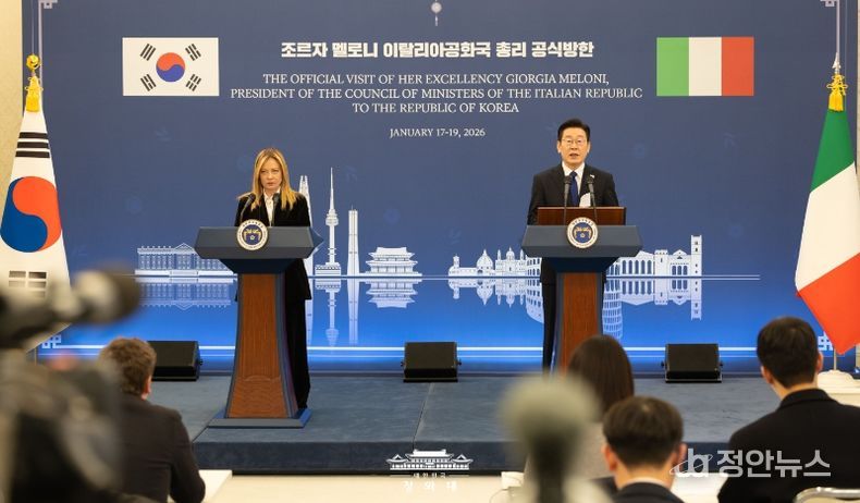 정안뉴스 안정주 기자 | 이재명 대통령은 19일 조르자 멜로니 이탈리아 총리와의 정상회담 뒤 "저와 멜로니 총리는 전략적 동반자 명칭에 부합하는 미래지향적 수준으로 양국 관계를 더욱 발전시켜 나가기로 합의했다"고 밝혔다.