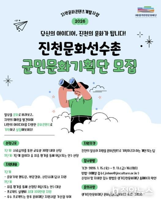 정안뉴스 황은경 기자 | 생거진천문화재단은 지역의 일상과 이야기를 문화콘텐츠로 만들어가는 문화 기획 프로젝트 ‘문화선수촌’에 참여할 군민문화기획단을 모집한다고 20일 밝혔다.