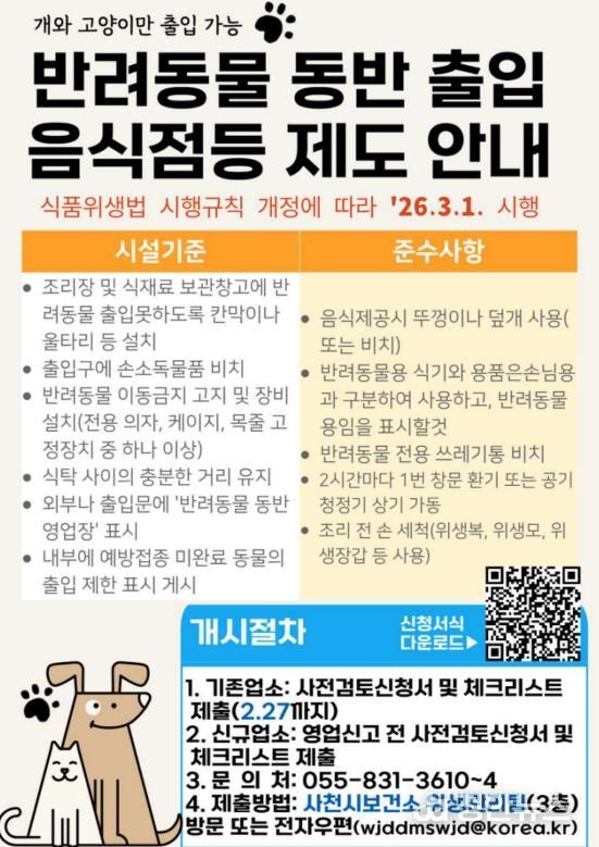 정안뉴스 김재홍 기자 | 사천시는 지역 내 일반음식점·휴게음식점·제과점을 대상으로 반려동물 동반 출입 음식점을 신청받아 운영할 예정이다.