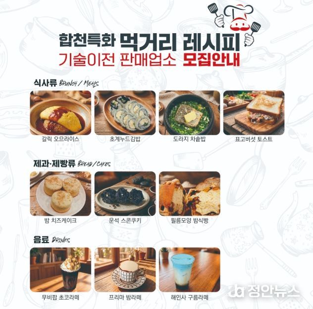 모집 대상은 합천군 내에 영업 신고가 된 일반음식점, 제과점, 휴게음식점 등이며, 기술이전을 통해 창업을 준비 중인 예비 창업자도 신청 가능하다.