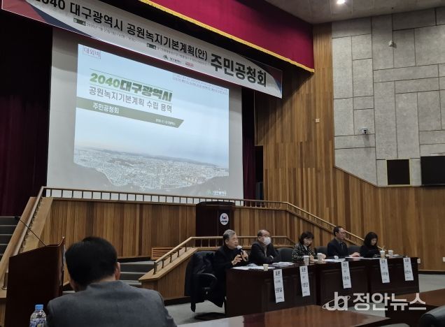 정안뉴스 안정주 기자 | 대구광역시는 1월 20일 오후 2시 대구문화예술회관 달구벌홀에서 공청회를 열어 ‘2040 대구 공원녹지기본계획(안)’을 시민에게 처음 공개하고, 향후 대구시 공원녹지 확충·관리·보전 계획을 설명했다.