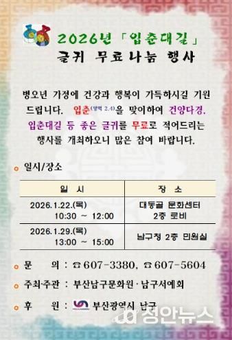 정안뉴스 황정혜 기자 | 부산 남구는 24절기의 첫 번째 절기인 입춘(2월 4일)을 맞아 구민의 안녕과 길운을 기원하는 '입춘방 나눔행사'를 개최한다고 밝혔다.