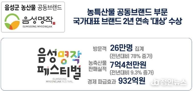 지난해 음성군은 농업의 내실과 외연이 동시에 확장된 해였다. 지역 농산물 통합 브랜드인 ‘음성명작’이 우수한 품질과 브랜드 파워를 인정받아 2년 연속 ‘국가대표 브랜드 대상’을 수상했다.