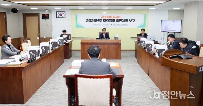 정안뉴스 황도연 기자 | 충남도의회 농수산해양위원회는 21일 제363회 임시회 1차 회의에서 충남도 남부출장소·농축산국·스마트농업본부·동물위생시험소·축산기술연구소로부터 2026년도 주요 업무계획을 보고받았다.