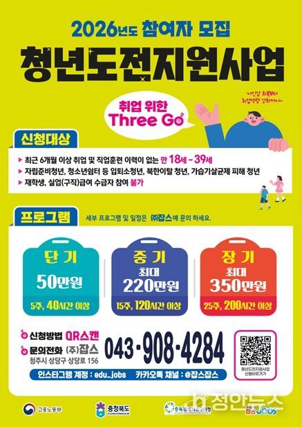정안뉴스 황은경 기자 | 충북경제자유구역청은 구직 의욕이 낮아진 도내 청년들의 원활한 사회 진출을 돕기 위해 고용노동부가 주관하는 ‘2026년 청년도전 지원사업’의 국비 11억 6,000만 원을 확보하고 본격적인 참여자 모집에 나선다고 밝혔다.