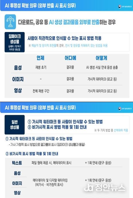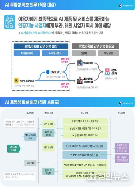 정안뉴스 안정주 기자 | 과학기술정보통신부는 1월 22일'인공지능 발전과 신뢰 기반 조성 등에 관한 기본법' ‘인공지능 기본법’)상 투명성 확보 의무(제31조)의 구체적인 이행 방안을 담은'인공지능 투명성 확보 안내 지침(가이드라인)'을 공개했다.