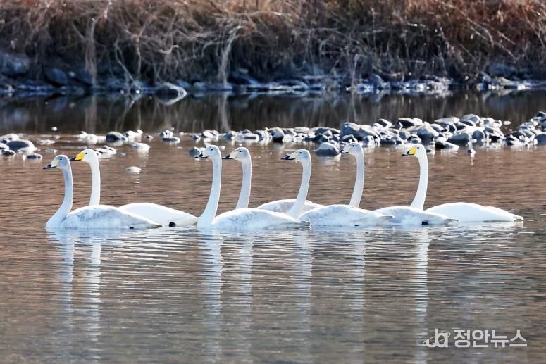 정안뉴스 황은경 기자 | 충북 괴산 달천강에 내려앉은 ‘겨울 진객’… 큰고니 가족의 평화로운 외출청정 괴산의 생태 지표로 주목영하권 추위가 몰아친 충북 괴산군 달천강변에 반가운 손님이 찾아왔다.