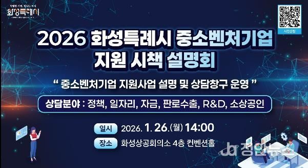 정안뉴스 안정주 기자 | 화성특례시가 관내 중소기업과 소상공인의 경영 애로 해소와 지원사업 활용도를 높이기 위해 오는 26일 화성상공회의소 컨벤션홀에서 ‘2026년 화성특례시 중소벤처기업 지원 시책 설명회’를 개최한다.