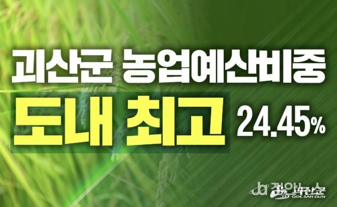 군이 23일 공개한 2026년 시·군별 예산 현황에 따르면 괴산군의 본예산 대비 농업 부문 예산 비율은 24.45%로 충북 11개 시·군 가운데 1위에 올랐다. 도 전체 평균(11.86%)과 비교해도 두 배를 훌쩍 넘는 지원이다.
