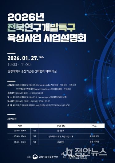 익산시는 오는 27일 원광대학교 숭산기념관에서 특구 내 기업, 대학, 연구기관을 대상으로 '2026 연구개발특구 육성사업 설명회'를 개최한다고 23일 밝혔다.