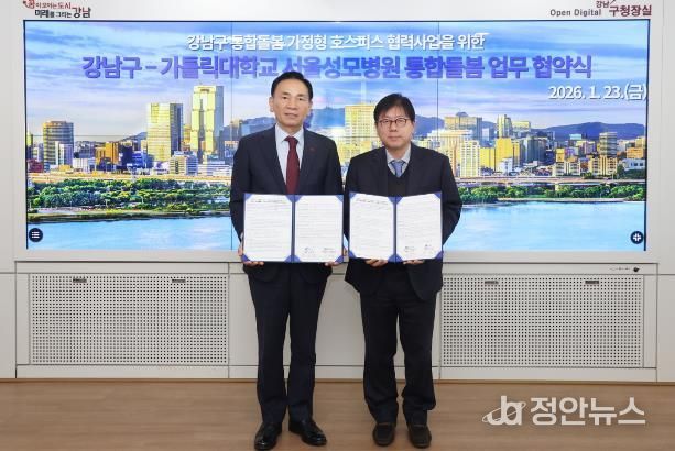 정안뉴스 안정주 기자 | 꿈이 모이는 도시, 미래를 그리는 강남구가 1월 23일 구청에서 가톨릭대학교 서울성모병원과 ‘강남구 통합돌봄 가정형 호스피스 협력사업’ 추진을 위한 업무협약(MOU)을 체결했다. 이 협약은 자치구와 상급종합병원이 연계해 가정형 호스피스를 지원하는 체계를 공식화했다는 점에서 그 의미가 크다.