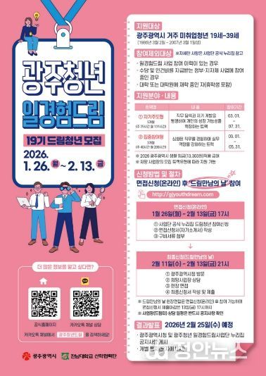 정안뉴스 안정주 기자 | 광주광역시는 올해 상반기 ‘광주청년 일경험드림’에 참여할 제19기 드림청년 450명을 1월26일부터 2월13일까지 모집한다.