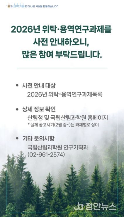 정안뉴스 안정주 기자 | 산림청 국립산림과학원은 산림 연구 인프라를 내실화하고, 대학 및 연구기관과의 전략적 협업을 확대하기 위해 2026년 위탁·용역연구과제를 사전 안내한다고 밝혔다.