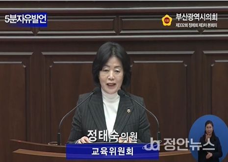 정안뉴스 안정주 기자 | 부산광역시의회 교육위원회 정태숙 의원(국민의힘, 남구2)은 1월 26일 열린 제333회 임시회 제1차 본회의 5분 자유발언을 통해, 황령산 생태숲에 조성된 ‘김소월 시와 함께 하는 길’에 이어서 머무를 수 있는 ‘K-문학 향유 공간 조성’이 필요하다고 강조했다.