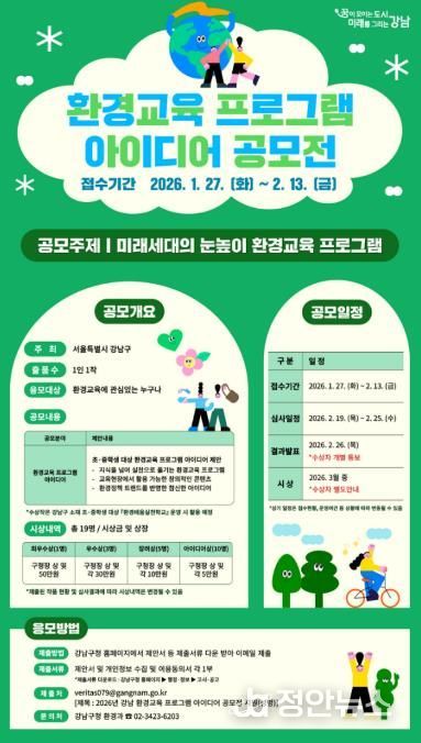 정안뉴스 안정주 기자 | 꿈이 모이는 도시, 미래를 그리는 강남구가 학교 현장에서 바로 활용할 수 있는 환경교육 콘텐츠를 발굴하기 위해 ‘2026년 강남 환경교육 프로그램 공모전’을 1월 27일부터 2월 13일까지 진행한다.