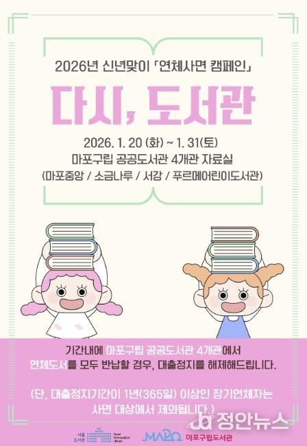 정안뉴스 안정주 기자 | 마포구는 2026년 새해를 맞아 도서 연체로 도서관 이용이 제한된 구민이 다시 도서관을 이용할 수 있도록 돕고, 일상 속 독서 참여를 확대하기 위해 연체사면 캠페인 '다시, 도서관'을 운영한다.