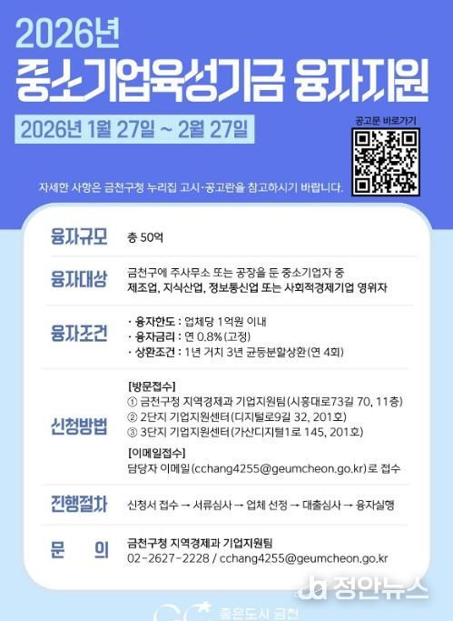 정안뉴스 안정주 기자 | 금천구는 자금 운용에 어려움을 겪는 지역 내 중소기업을 지원하기 위해 50억 원 규모의 ‘2026년도 중소기업육성기금 융자지원 사업’을 추진한다고 밝혔다.