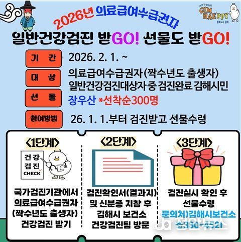 정안뉴스 김재홍 기자 | 김해시보건소는 2026년 새해를 맞아 의료 취약계층의 질병을 조기에 발견하고 예방하기 위해 의료급여수급권자를 대상으로 『일반건강검진 받GO! 선물도 받GO!』 이벤트를 실시한다고 밝혔다.