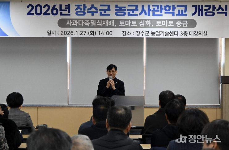 정안뉴스 안정주 기자 | 장수군은 지난 27일 농업기술센터 대강의실에서 교육생 130여 명이 참석한 가운데 ‘2026년 장수군 농군사관학교 개강식’을 성황리에 개최했다.