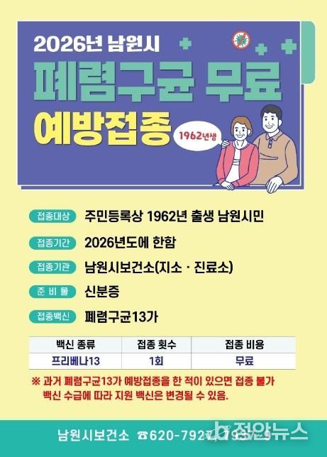 올해는 주민등록상 남원시에 주소를 둔 64세 시민(1962년생)을 대상으로 폐렴구균 13가 예방접종을 실시하고 있으며, 접종은 보건소와 보건지소, 보건진료소에서 가능하다. 이번 지원은 2026년 한 해에 한하여 제공되는 만큼 대상자는 서둘러 접종하기를 권한다.