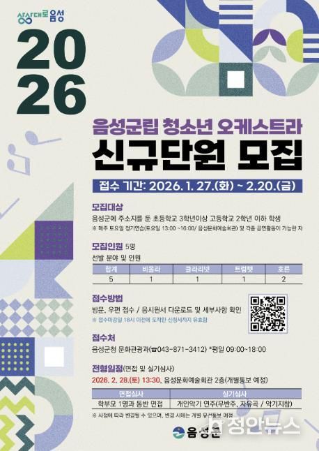 오디션은 2월 28일 오후 1시 30분 음성문화예술회관에서 진행되며, 무반주 자유곡 연주와 면접을 통해 최종 단원을 선발한다. 합격자는 오는 3월 4일 음성군청 홈페이지를 통해 발표될 예정이다.