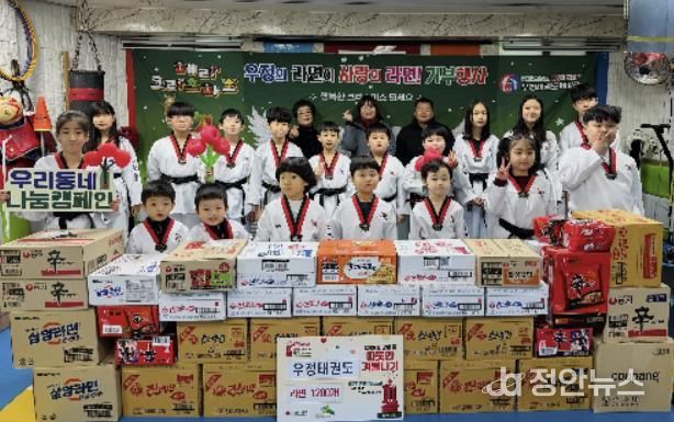 이번 기부는 우정태권도 원아들과 학부모가 함께 준비했으며, 기부받은 라면 1천2백 개는 관내 취약계층에 전달할 예정이다. 우정태권도는 매년 지속적인 나눔 활동을 통해 지역 내 취약계층 지원에 동참하고 있다.
