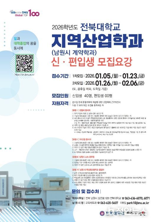 정안뉴스 안정주 기자 | 남원시와 전북대학교는 지역 특화산업 전문인력 양성을 위해 2026학년도 전북대학교 지역산업학과(남원시 계약학과) 2차 신·편입생을 모집하고 있다고 밝혔다.