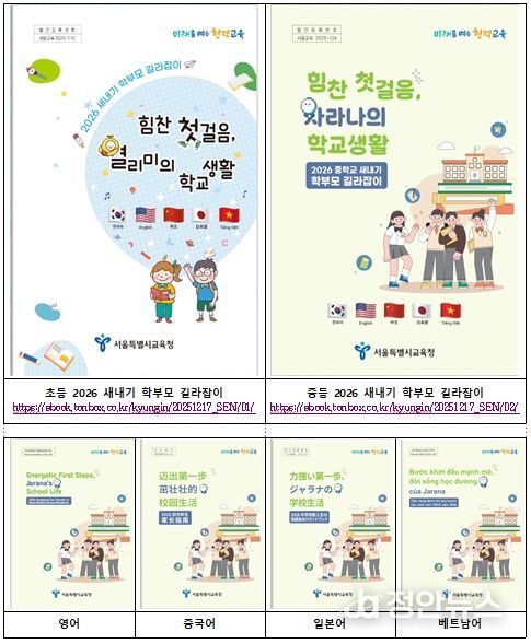 서울시교육청은 2026학년도에도 기존 초등 새내기 학부모 길라잡이를 최신 교육정책 변화에 맞춰 보완·개정했으며, 올해 처음으로 중학교 입학을 앞둔 학부모를 위한 '2026 중학교 새내기 학부모 길라잡이'를 신규로 편찬했다.