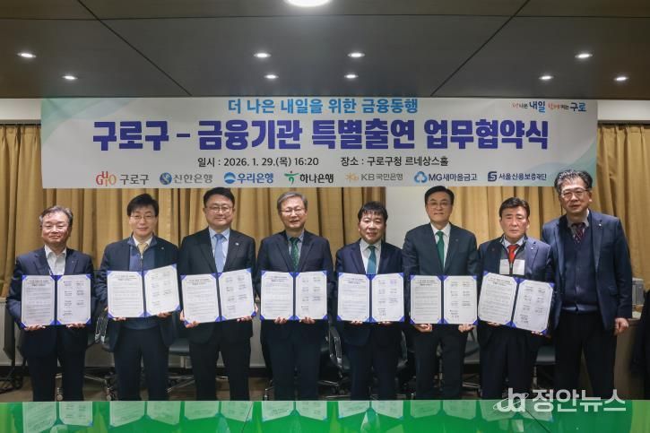 정안뉴스 안정주 기자 | 구로구가 1월 29일 구청 3층 르네상스홀에서 신한은행, 우리은행, 하나은행, 국민은행, 새마을금고, 서울신용보증재단과 ‘더 나은 내일을 위한 금융동행’ 특별출연 협약을 체결하고, 총 212억 5천만 원 규모의 중소기업·소상공인 특례보증을 추진한다.