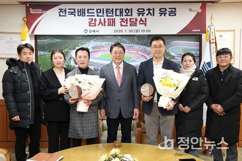 정안뉴스 김재홍 기자 | 김해시는 30일 오전 10시 시장 접견실에서 ‘제42회 대한배드민턴협회장기 생활체육 전국배드민턴대회’ 유치 유공자에게 감사패를 전달했다.