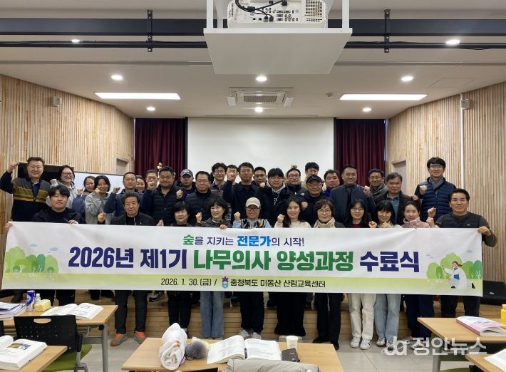 정안뉴스 황은경 기자 | 충청북도산림환경연구소는 지난 1월 5일부터 30일까지 미동산산림교육센터에서 운영한 ‘2026년 제1기 나무의사 양성과정’을 마치고, 교육과정을 이수한 교육생 32명을 배출했다.