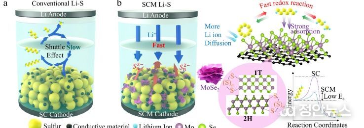 이 복합 구조에서 MoSe2의 결함과 상 경계는 다수의 활성점을 형성해 폴리설파이드를 강하게 흡착해 이동을 억제하는 동시에, 전자와 리튬 이온의 전달을 가속화시켜 반응 장벽을 낮춘 것으로 연구팀은 확인했다.