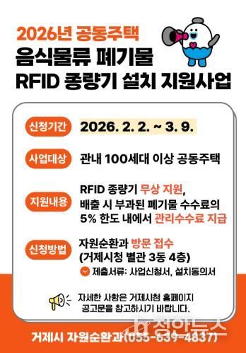 정안뉴스 김재홍 기자 | 거제시는 지난해에 이어 올해도 공동주택을 대상으로 음식물류 폐기물 RFID 종량기 설치 지원사업을 추진한다고 밝혔다.