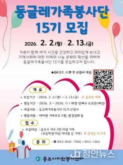 정안뉴스 황은경 기자 | 충주시자원봉사센터(센터장 심영자)는 관내에 거주하는 초등학생 이상 자녀를 둔 2인 이상 가족을 대상으로 15기 둥글레가족봉사단으로 활동할 15가족을 선착순 모집한다.