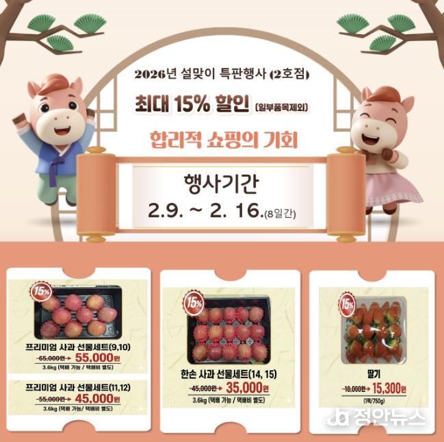 주요 판매 품목으로는 설 선물로 인기가 높은 사과, 배, 샤인머스켓, 딸기 등 과일 선물세트를 비롯해 곶감세트, 한과세트, 잡곡류, 더덕, 도라지, 고구마 등 제천의 기운을 담은 다양한 품목이 준비되어 있다. 특히 고품질 프리미엄 사과 선물세트와 실속형 한손 사과 세트 등 가격대별로 선택의 폭을 넓혔다.
