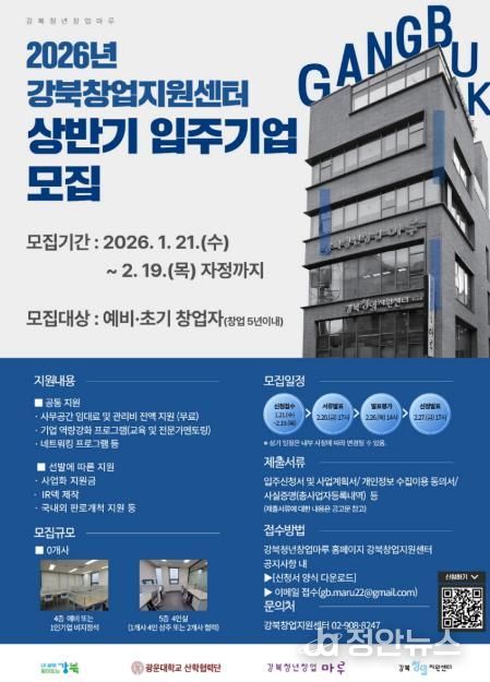 한편, 강북창업지원센터는 오는 19일까지 2026년 상반기 신규 입주기업을 모집한다. 모집 대상은 15세 이상 예비창업자 및 창업 5년 이내 초기 창업기업으로, 심사에서는 성장 가능성과 사업 실행력을 중심으로 평가할 예정이다.