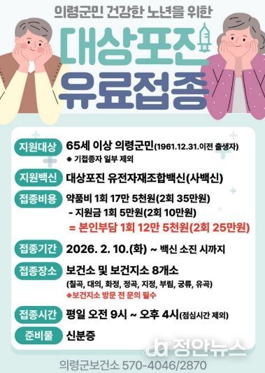 정안뉴스 김재홍 기자 | 의령군은 10일부터 65세 이상 의령군민을 대상으로 대상포진 예방접종 지원사업을 시행한다고 4일 밝혔다.
