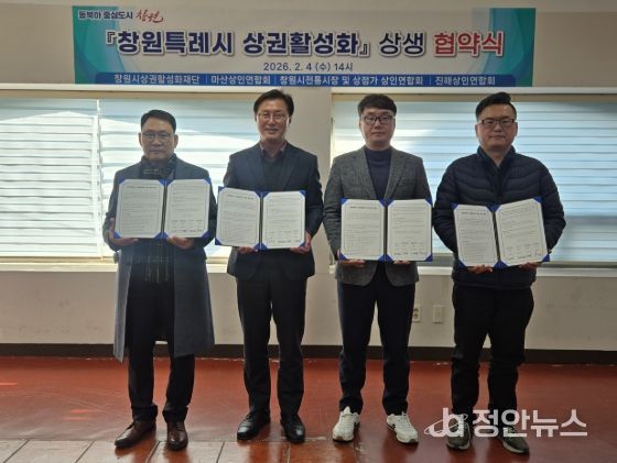 정안뉴스 김재홍 기자 | 창원시상권활성화재단(이사장 장금용)은 2월 4일 오후 2시, 창원시상권활성화재단 어울림센터에서 마산통합상인연합회, 창원시 전통시장 및 상점가 상인연합회, 진해상인연합회(대표시장: 진해중앙시장)와 '창원특례시 상권활성화'를 위한 상생 업무협약을 체결했다.
