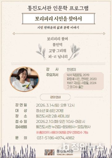 이번 강의는 2월 10일 오전 10시부터 통진도서관 누리집에서 신청할 수 있으며, 한하운 시인에 대해 관심 있는 청소년 및 성인 20명을 선착순으로 모집한다.