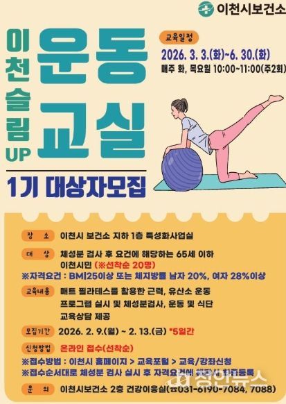 신청은 2월 9일부터 2월 13일까지 이천시 누리집(홈페이지) 교육포털 시스템을 통해 가능하며, 선착순 접수 순서대로 보건소 체성분 검사 실시 및 자격요건 충족 시 최종 등록된다.