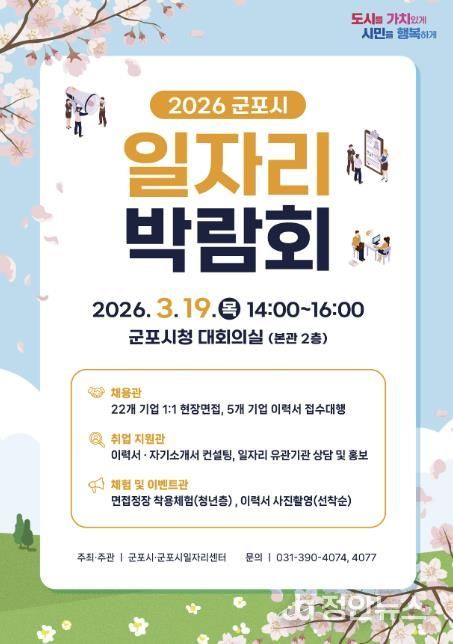정안뉴스 안정주 기자 | 군포시는 오는 3월 19일 오후 2시부터 시청 대회의실에서 ‘2026년 군포시 일자리 박람회’를 개최함에 따라 2월 10일부터 2월 27일까지 박람회에 참여할 기업체를 모집한다.