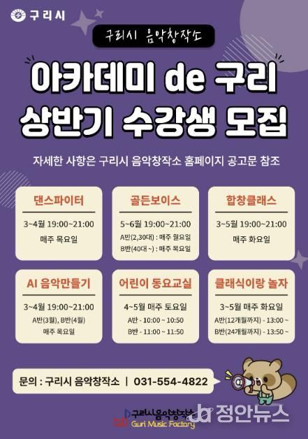 정안뉴스 안정주 기자 | 구리시는 잠재적 예술인 양성을 위해 구리시 음악창작소에서 운영하는 '2026 상반기 아카데미 de’구리'의 수강생을 2월 2일부터 모집하고 있다고 밝혔다.