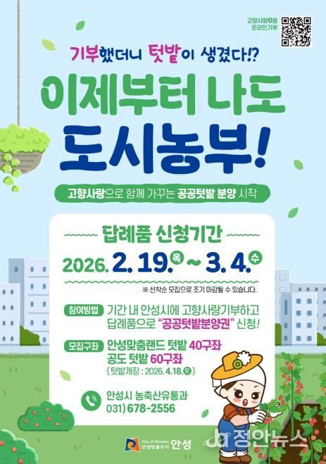 정안뉴스 안정주 기자 | 안성시는 오는 2월 19일부터 고향사랑기부제를 통해 도시농업을 체험하는 ‘도시농부’를 모집한다고 밝혔다.