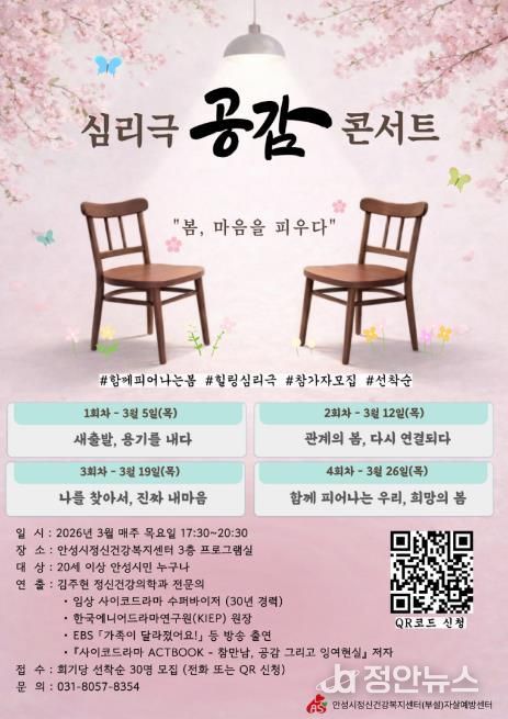 정안뉴스 안정주 기자 | 안성시보건소 안성시정신건강복지센터(부설 자살예방센터)는 시민의 정신건강 증진과 생명존중 문화 조성을 위해 심리극(사이코드라마) 기법을 활용한 체험형 집단 프로그램 '공감' 콘서트를 오는 3월 운영한다고 밝혔다.