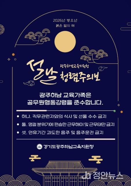 정안뉴스 안정주 기자 | 경기도광주하남교육지원청은 2월 9일, 2026년 병오년 설명절을 맞아 관내 교직원들이 청렴한 마음가짐으로 새해를 시작할 수 있도록‘교육장 청렴서한문’과‘청렴주의보’를 각급 학교에 전달했다.